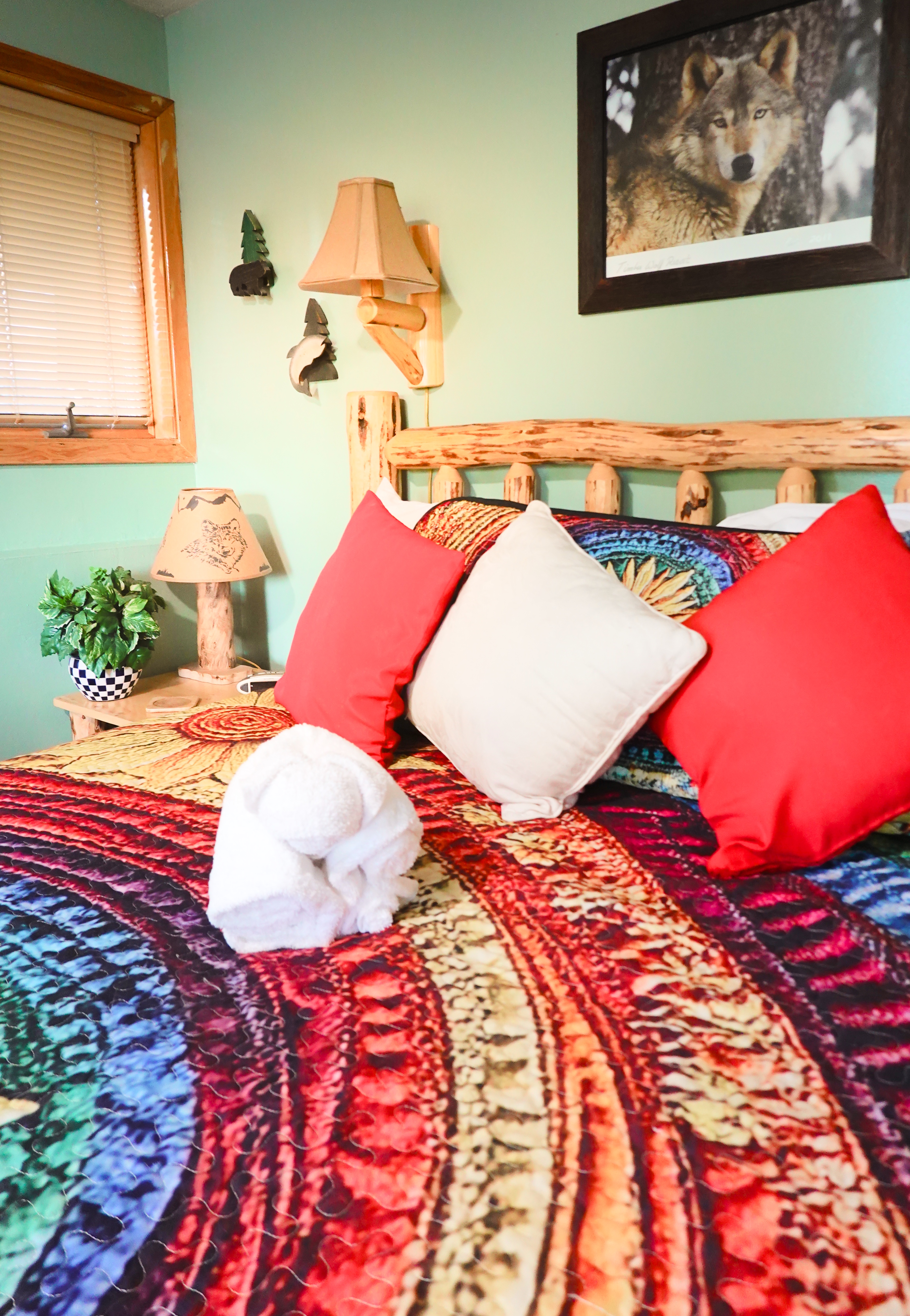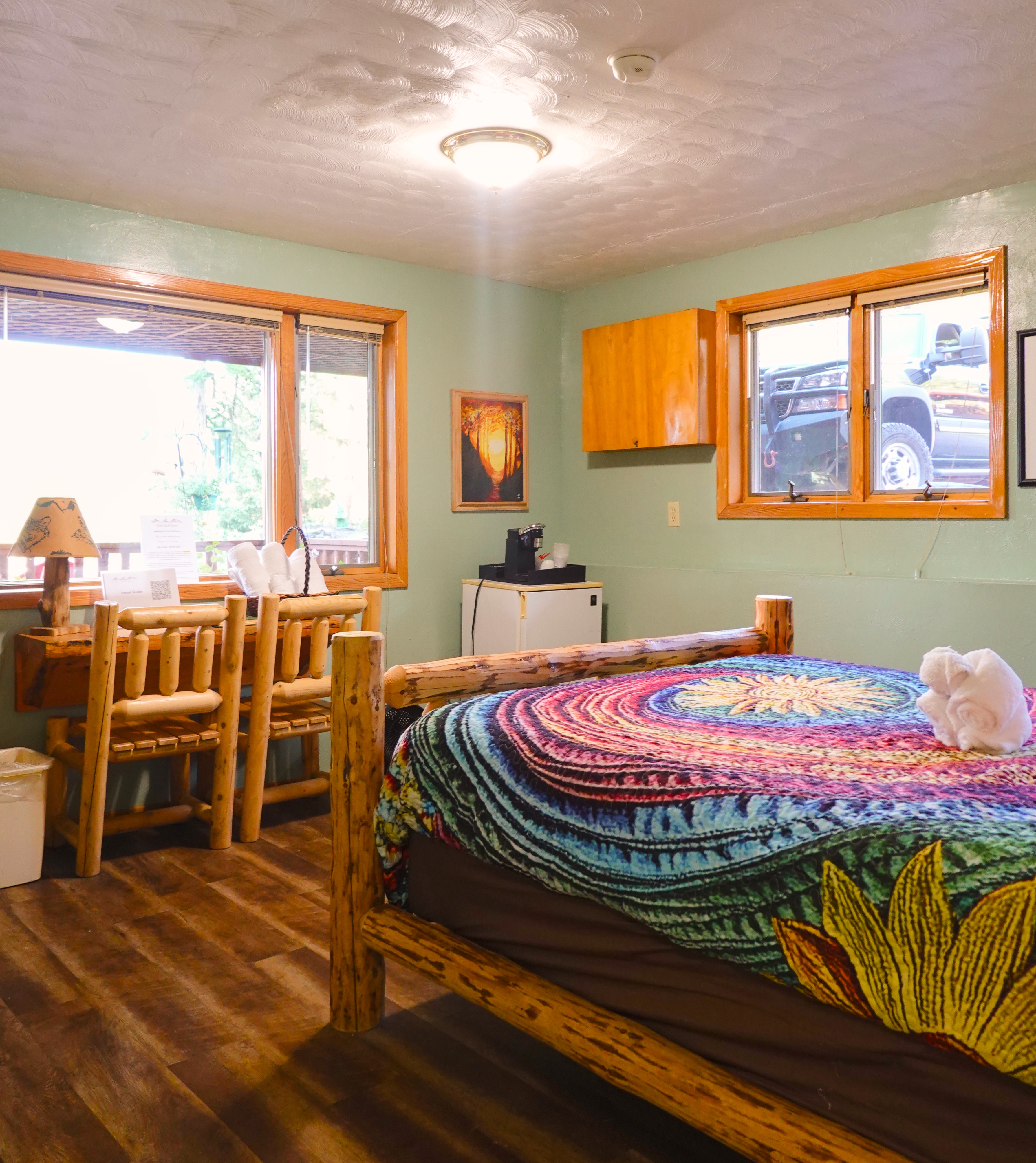 After a day of sacred gathering, quiet reflection, and meaningful connection, return to your cozy lodge room—a simple, grounding space designed to support deep rest and renewal. Handcrafted log furnishings, soft towels, fresh bed linens, and a snuggly quilt atop a comfortable queen bed create a sense of warmth and ease. A large picture window opens your view to the awe-inspiring peaks of Glacier National Park, inviting stillness, prayer, and moments of gratitude. Shared restrooms are just down the hall and offer private, enclosed stalls and commercial-grade showers, providing comfort, privacy, and a gentle transition into rest.